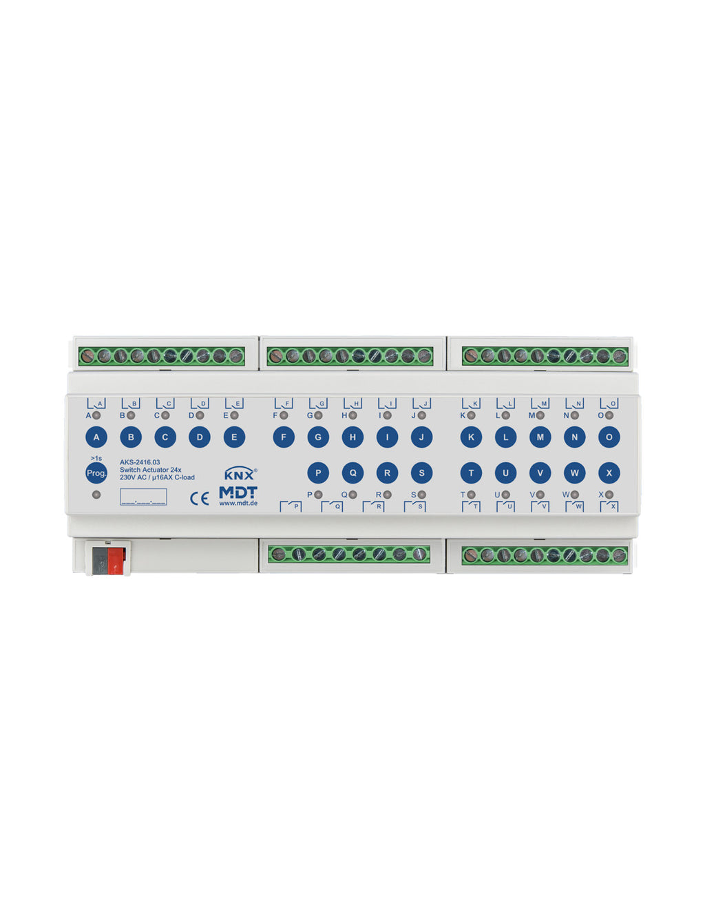 Standardowa wersja aktora przełączającego MDT AKS 16A posiada szeroki zakres funkcji dla średnich i dużych obciążeń. Oferuje więcej kanałów, przy mniejszej wielkości. Oszczędza to koszty na kanał i podrozdzielnię. Siłownik jest wyposażony w przekaźniki bistabilne dla prądów do 16A i dużych obciążeń C do 140 µF. Każdy kanał może być przełączany bezpośrednio na aktorze za pomocą przycisku.