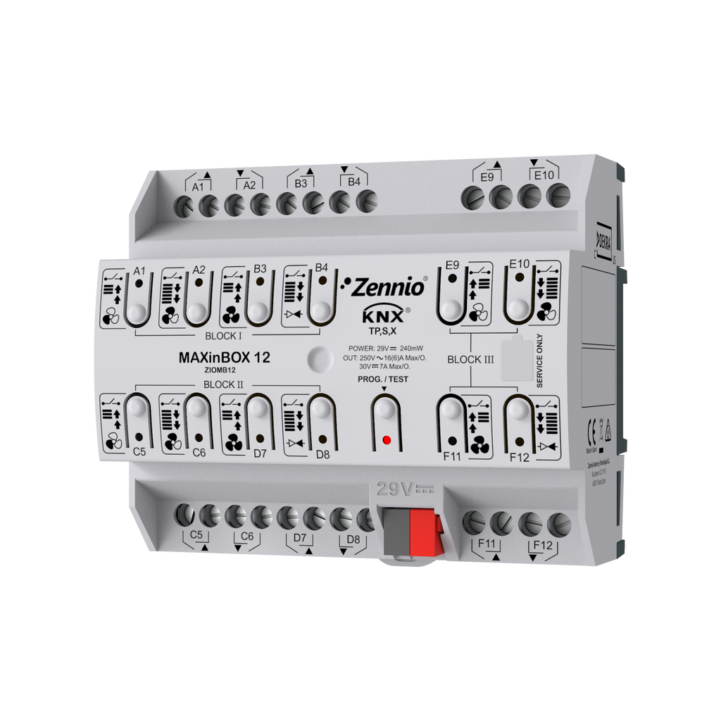 Wielofunkcyjny aktor sterujący do montażu na szynie DIN (6 modułów), oferujący wiele konfiguracji do 6 kanałów żaluzji, do 12 niezależnych wyjść 16A (obsługa obciążeń pojemnościowych) i do 3 bloków 2-rurowego regulatora klimakonwektora. Umożliwia ręczne sterowanie wyjściami za pomocą przycisków na obudowie. Wskaźniki LED mogą pokazywać stan jego wyjść. Zawiera 30 niezależnych funkcji logicznych, które zwiększają wszechstronność automatyki w systemie KNX. Jest kompatybilny z KNX Secure.