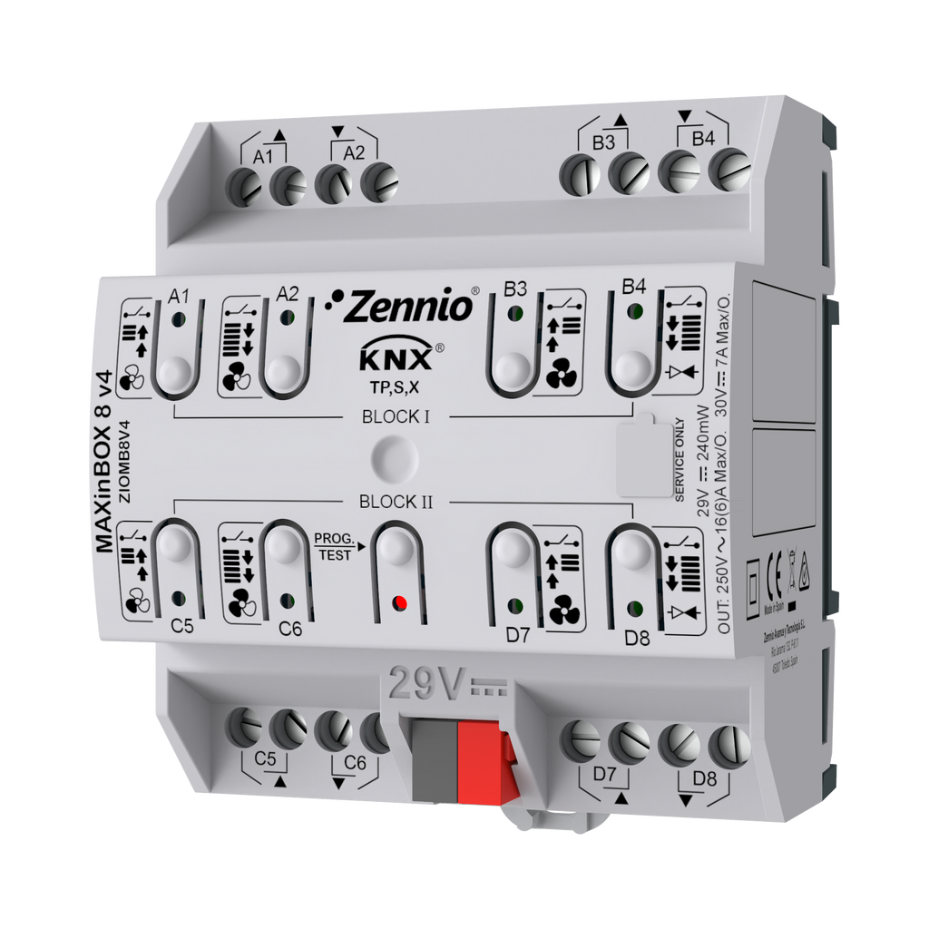 Wielofunkcyjny moduł wykonawczy do montażu na szynie DIN (4,5 modułów) z 8 wyjściami (16 A C-Load), które oferują wiele konfiguracji jako kanały żaluzji, jako indywidualne wyjścia lub jako bloki 2-rurowego sterownika klimakonwektora. Umożliwia ręczne sterowanie wyjściami za pomocą przycisków na obudowie. Zawiera 20 niezależnych funkcji logicznych. Jest kompatybilny z KNX Secure.