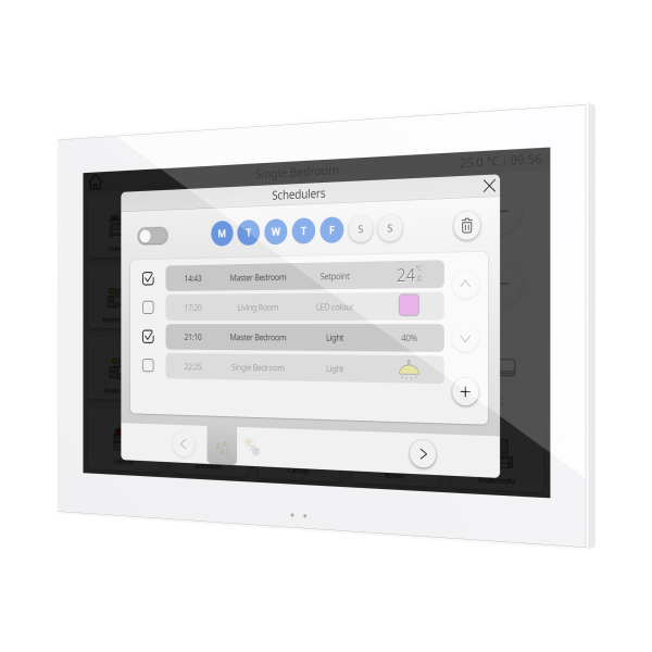Panel dotykowy pojemnościowy z 10-calowym wyświetlaczem LCD o rozdzielczości 1280×800 pikseli i 16 milionami kolorów, umożliwiający kompleksowe sterowanie domem, pokojem hotelowym lub innym rodzajem instalacji dzięki 12 w pełni konfigurowalnym stronom, zachowujący ponadczasową i minimalistyczną estetykę. Zawiera czujnik oświetlenia otoczenia do automatycznej regulacji jasności, a także czujnik zbliżeniowy do szybkiego uruchamiania po wykryciu aktywności, który może również uruchamiać skonfigurowany wygaszacz ekranu. Ponadto posiada 2 termostaty i 4 wejścia analogowo-cyfrowe. Posiada porty USB i Ethernet do aktualizacji oprogramowania.