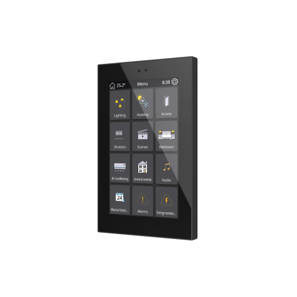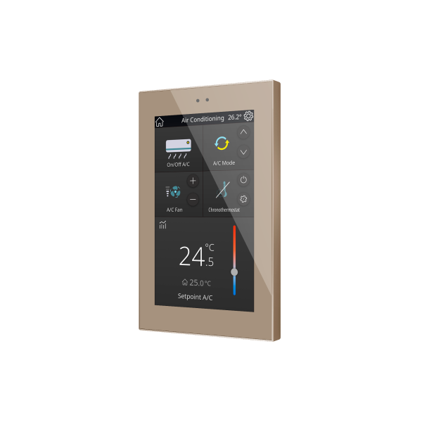 Panel dotykowy o przekątnej 5 cali w orientacji pionowej lub poziomej i rozdzielczości 480 x 854 pikseli, który umożliwia pełną kontrolę nad instalacją dzięki 12 w pełni konfigurowalnym stronom, zachowując jednocześnie minimalistyczną estetykę. Posiada 2 wejścia analogowo-cyfrowe, wewnętrzną sondę temperatury i 2 niezależne termostaty. Zawiera również czujnik zbliżeniowy do wykrywania aktywności w celu szybkiego uruchomienia, a także wyłączenia wygaszacza ekranu, jeśli jest skonfigurowany. Ponadto posiada porty USB i Ethernet do aktualizacji oprogramowania.